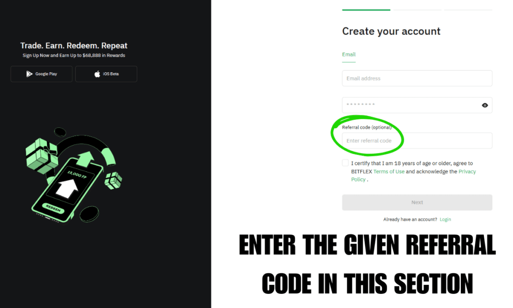 Step 4: Type in the Bitflex Referral Code